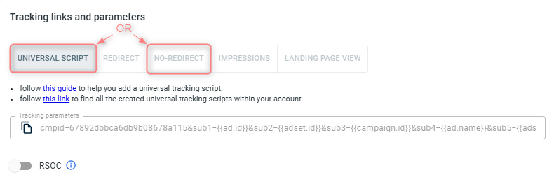 – If you choose the No-Redirect tab: once the campaign is saved, both the tracking parameters and the script are generated automatically. You only need to copy and apply them.