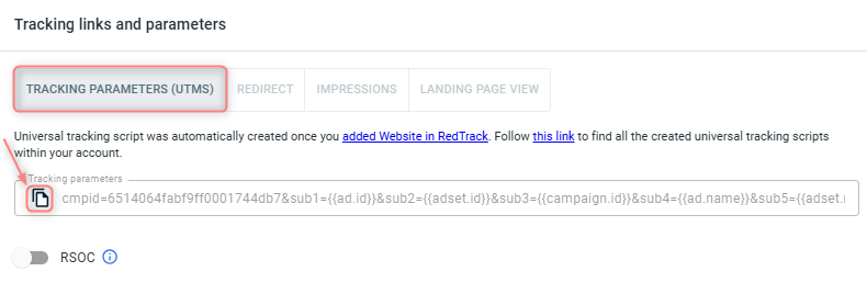 2. Once the Campaign is saved go to Tracking links and parameters → copy the corresponding tracking parameters and the script depending on tracking method you decided on: