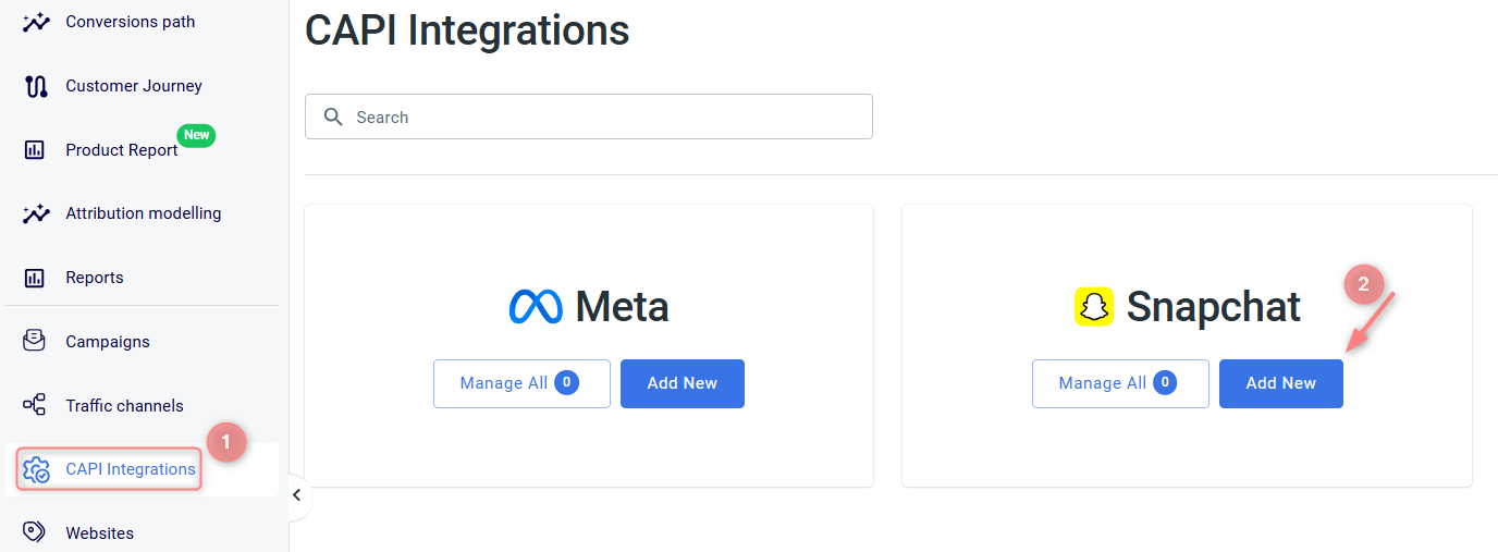 1. RedTrack → CAPI Integrations → Snapchat → Add New: