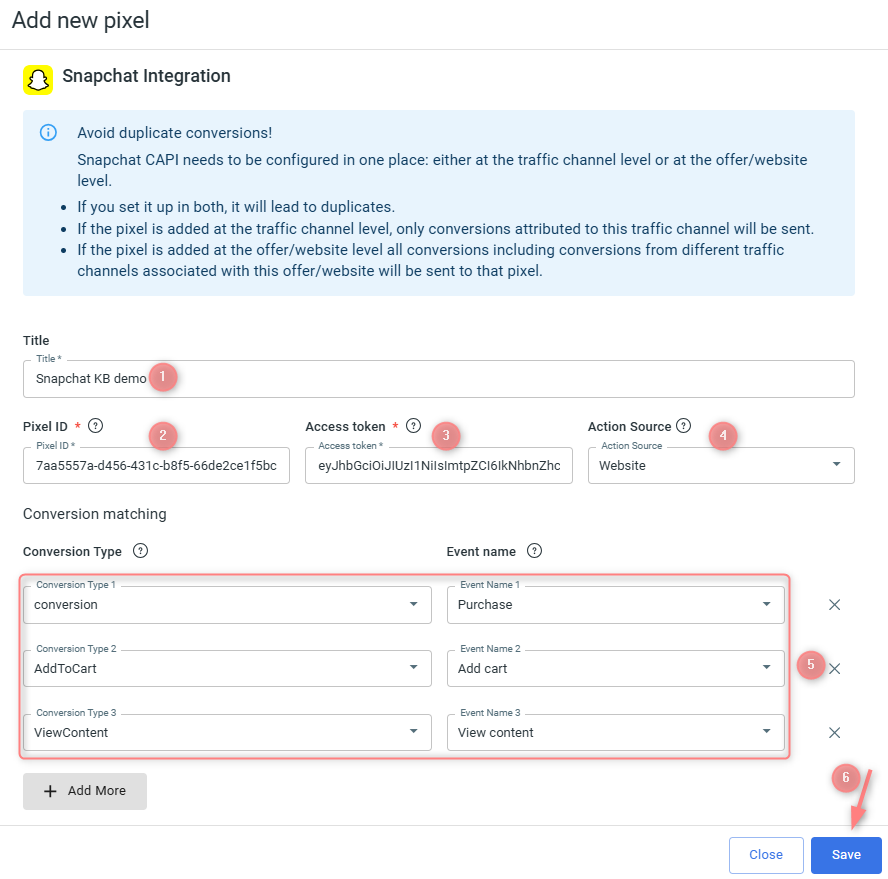 2. Fill in the mandatory fields → match RT conversion event types with the ones in Snapchat → Save: