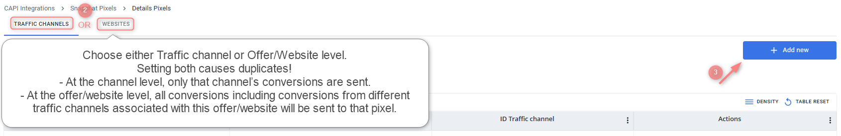 3. To assign this pixel: View details → select Traffic channel or Websites → Add new → select destination → Save: